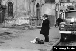 Он очень много ездил по Украине. И вот этого у него много. Он выбирал типичные ситуации образа жизни советского человека. Он в квартиры не заходил, не мог, а кроме того, он был фотографом архитектуры. Поэтому абсолютное большинство его фотографий сделаны на улице, на фоне домов, на фоне оформления улиц. Человек у него часть города. Он выбирал не эстетические моменты, а выбирал социальные моменты: очередь; появилась американская машина – он фиксирует толпу возле этой машины; продали селедку и выливают маринад на улицу; грязная подворотня и идет несчастная женщина. Может, она и не несчастная, но в окружающем ужасе она выглядит беспросветно. С другой стороны, и жизнь беспросветна в этой подворотне с надписью "Слава КПСС".
